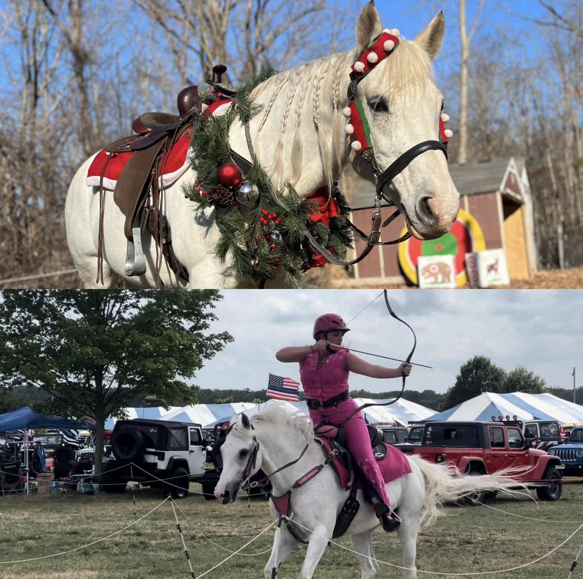 Pearl also does jumping and gymkhana. She has been doing archery for 5 years now. She is willing to try whatever you ask of her. A great beginner horse. Is gated but has a trot as well, moves out and not everyone’s kind of ride but if you like it, you can fly! Needs a balanced rider for faster gaits. 10-12 sec. straight track competition horse.