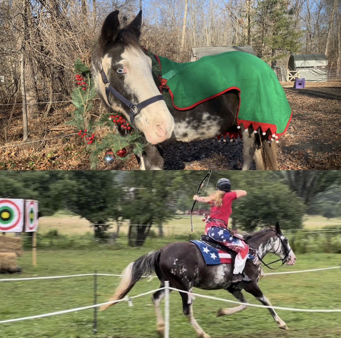 He is capable of carrying any size archer. He is the newest member of our team. Kodi has a nice walk, trot and canter but more ‘woah’ than go. He is a sweet boy and stunning.
